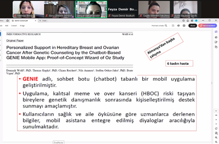 Etkinliğin moderatörü Öğr. Gör. Dr. Ebru Cirban EKREM, konuşmacı ise Gazi Üniversitesi Hemşirelik Fakültesi Doğum ve Kadın Hastalıkları Hemşireliği Anabilim Dalı’ndan Prof. Dr. Şengül YAMAN SÖZBİR idi. Webinarda, mobil sağlık uygulamalarının meme kanserinde erken tanı, farkındalık ve hasta takibinde sunduğu katkılar ele alındı.