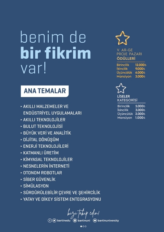 Bölgenin en önemli bilim ve teknoloji etkinliklerinden biri olan Bartın Üniversitesi (BARÜ) “Ar-Ge Proje Pazarı” heyecanı yeniden başlıyor. 2017 yılından bu yana yoğun bir ilgiyle gerçekleştirilen etkinlik kapsamında bu yıl da rekor başvuru bekleniyor. Bilim ve teknoloji konusunda farkındalığı artırmak, gençlerin geleceği şekillendirecek gelişmelere odaklanmaları sağlamak amacıyla düzenlenen organizasyonla Milli Teknoloji Hamlesi’ne katkılar sunulması hedefleniyor.