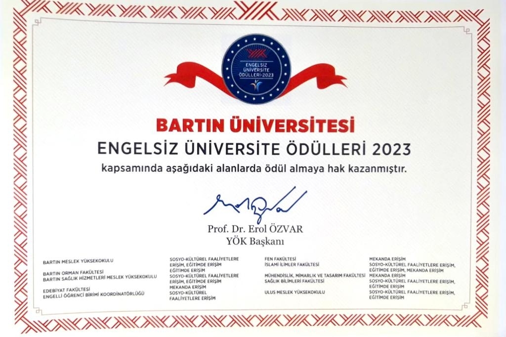 Üniversitelerde engelsiz bir ekosistemin oluşturulmasını teşvik etmek amacıyla gerçekleştirilen “Engelsiz Üniversiteler Ödülleri”nde 2023 yılı kazananları Yükseköğretim Kurulunda (YÖK) düzenlenen törenle açıklandı. YÖK Başkanı Prof. Dr. Erol Özvar tarafından ilan edilen listede 97 üniversiteden 1.091 başvuru yapıldığı ve 56 üniversitenin 295 bayrak almaya hak kazandığı ifade edildi. “Engelsiz Üniversite ve Erişilebilir Kampüs” anlayışıyla önemli çalışmaların yapıldığı Bartın Üniversitesi (BARÜ) 16 ödüle birden layık görülerek, Türkiye’de 4’üncü olmaya hak kazandı.